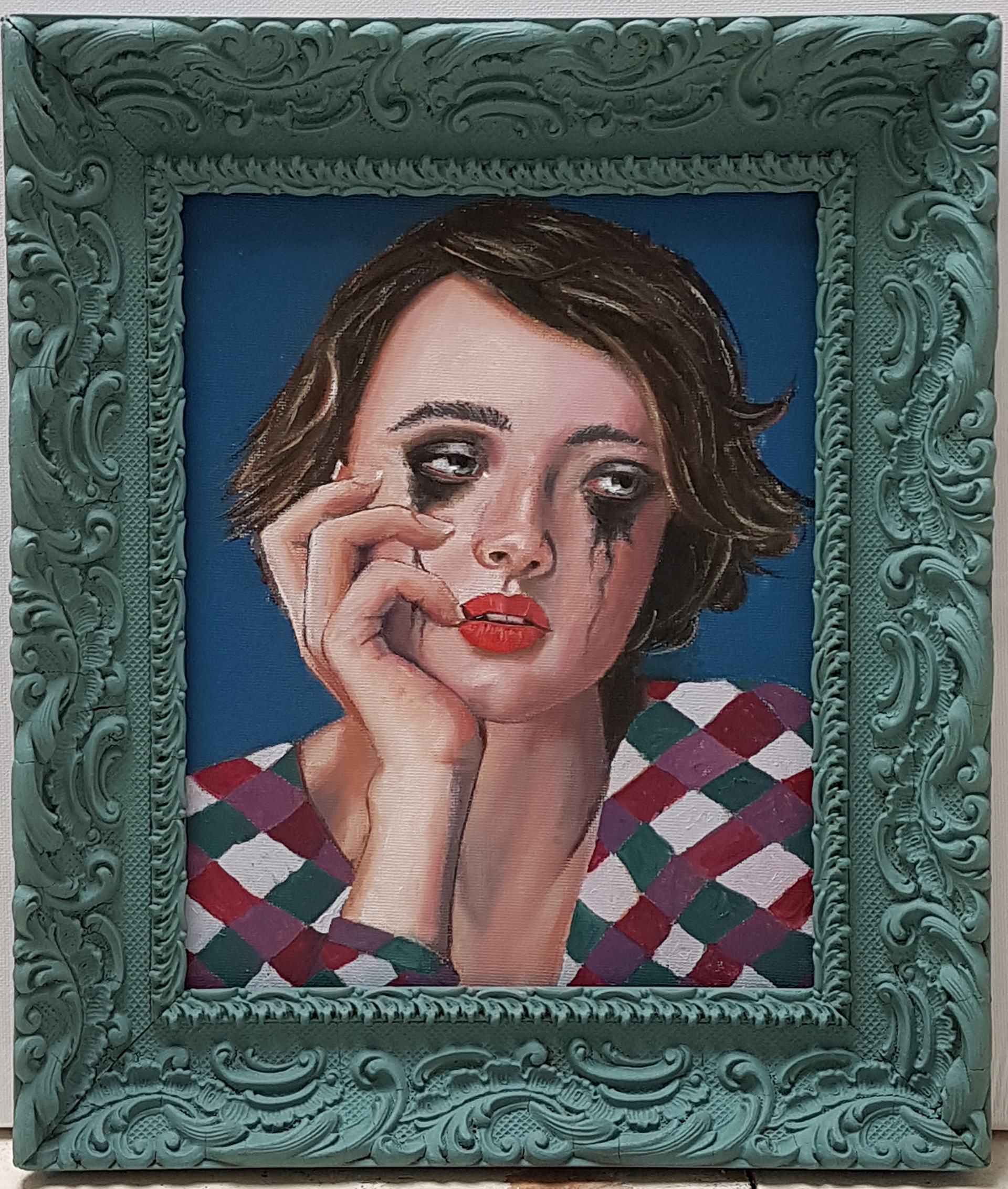 Tears of a clown - pierrette crying. Painted in oils in an antique frame